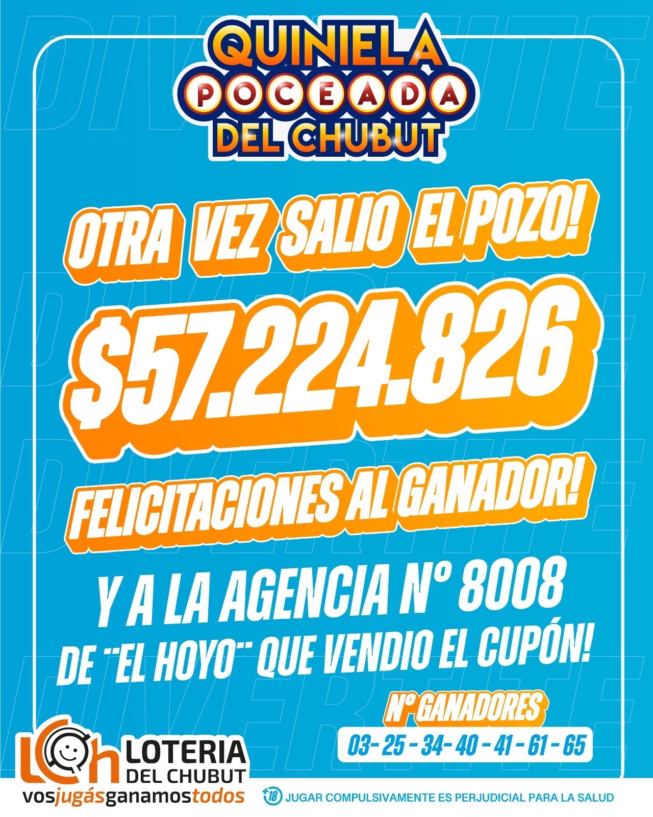 En menos de dos meses, un nuevo apostador resultó ganador del Premio Mayor de la Quiniela Poceada de Lotería del Chubut, llevándose en esta oportunidad un total de 57.224.826,45 pesos correspondientes a siete aciertos, en el sorteo realizado el pasado 22 de enero.